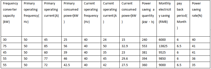 The field needs,and in the same output speed under the condition of power consumption is also higher than asynchronous motor about 20%;When the speed is reduced,the slip motor has lower efficiency and higher power consumption compared with asynchronous motor.Therefore,the variable frequency speed contorl system is used to replace the slipe speed control,overcome the above shortcomings,the speed contorl performance is far higher than the slip speed control motor,at the same time,the maintenance cost is also greatly reduced,has been widely used in the industry,cement co.,Ltd. And other unloading process conversion transformation.The energy-saving effect is shown in Table 3.