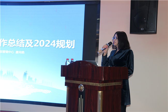Ms. Tang, the marketing director of the International Marketing Center, reported the sales performance and sales management expenses of the international Marketing Department in 2023, and summarized the problems and shortcomings in management in this year, and proposed solutions in technical support, competitive product learning, business management, safety inventory and exchange rate logistics. Looking forward to 2024, Mr. Tang put forward personal opinions and suggestions on team building, market regional planning and verification of regional planning, market management and market promotion.