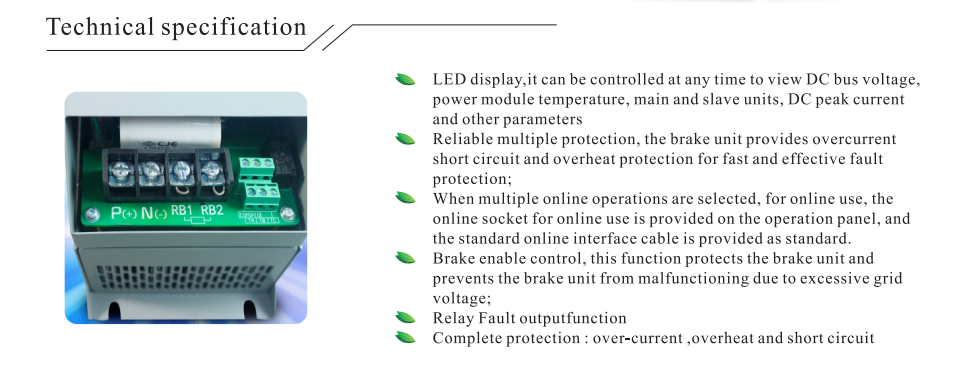 The PB200 series brake unit is designed by Powtran with advanced concept, it is a new type of inverter controlled motor which has increased the function of the keyboard.With excellent control performance and high reliability, can easily read the setting of various parameters;The function of the hardware and software is redesigned, and the function of current sampling is added.Over current, overload, short circuit, IGBT direct protection functions, the operation is reliable and stable.Increase the voltage tracking brake, the braking process is more smooth; increase the forced air cooling,Independent air duct design, fan external maintenance, with the function of the master and slave machine, more convenient for the brake unit to be used in parallel