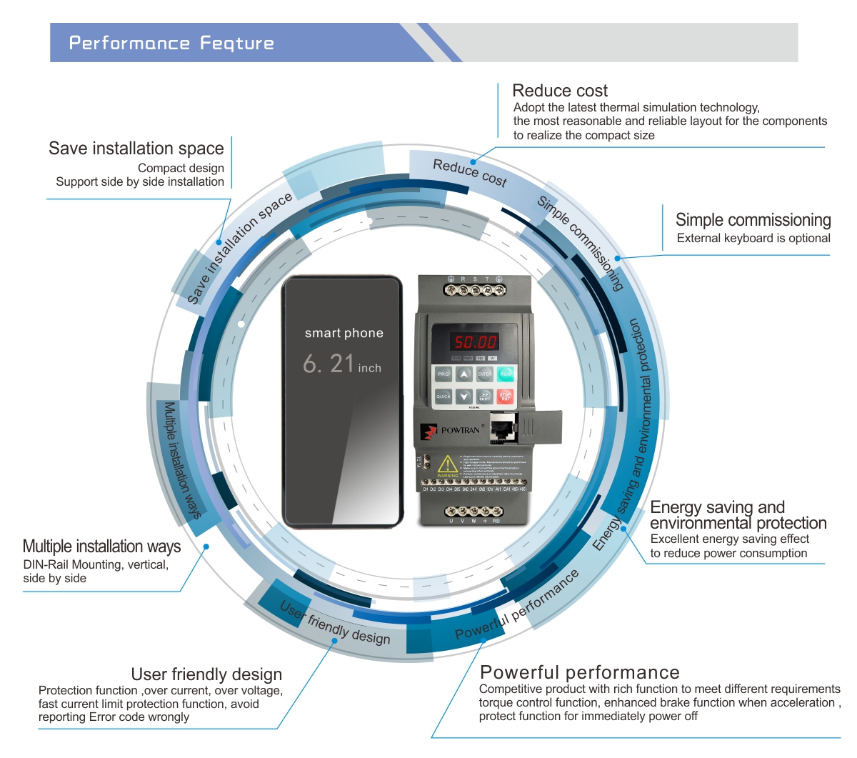 Powtran PI150 series smart frequency inverter is based on the market,with brand new design concept,a new generation of low-power inverters has been developed,which makes debugging easier,more efficient,and more reliable.