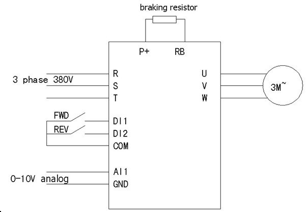L1 / L2 / L3 to 380 V input, P + and RB connect braking resistor, U/V/W connect motor .