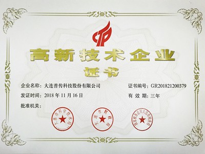 2019年2月20日,大連普傳科技股份有限公司通過了由科技局、財政局和國家稅務機關組織的高新技術企業認定,并榮獲“高新技術企業”稱號。這是我公司堅持以科技創新促進企業不斷發展壯大的又一碩果,是對我公司多年來堅持技術創新、堅持走高新技術發展道路的最好詮釋和有…