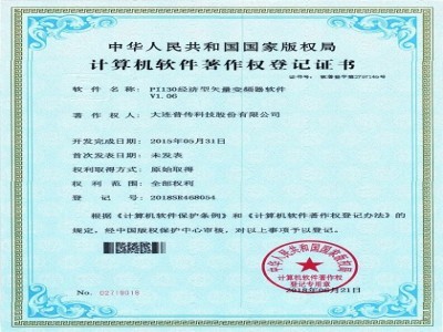 近日,大連普傳科技股份有限公司成功獲得4項計算機軟件著作權。分別為:《PI130經濟型矢量變頻器軟件V1.06》、《PI160經濟型矢量變頻器軟件V1.00》、《PB200能耗制動單元軟件V1.01》、《PR5300智能化電機軟起動器軟件V1.00》。經中華人民共和國國家版權局考證,根據《中華人民…