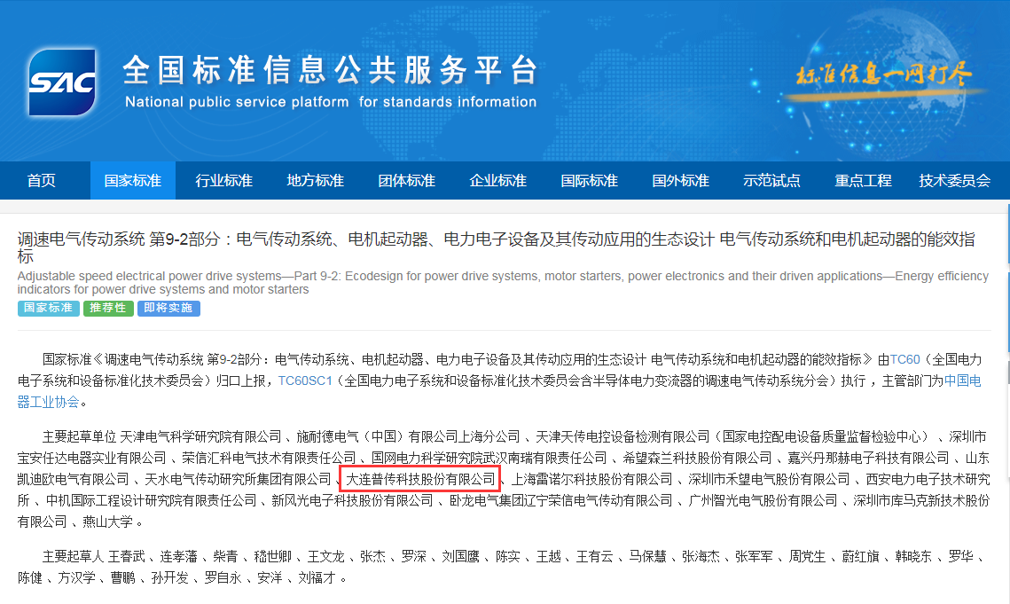 2021年3月9日,大連普傳科技股份有限公司參加起草的《調速電氣傳動系統》系列第9-2部分電氣傳動系統、電機起動器、電力電子設備及其傳動應用的生態設計 電氣傳動系統和電機起動器的能效指標正式發布。