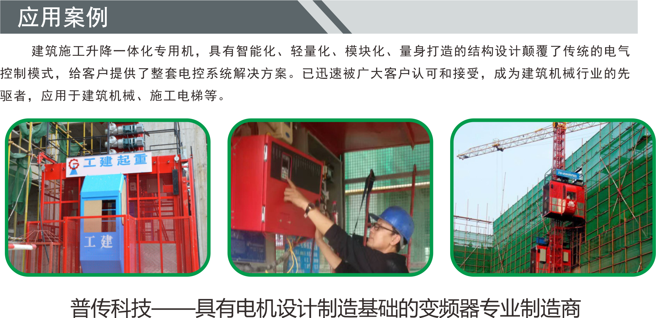 PS550-L系(xi)列建(jian)筑施工(gong)(gong)升降(jiang)一體化專(zhuan)用機(ji)(ji)(ji)是(shi)普傳科技(ji)最新研發(fa)的(de)專(zhuan)門(men)針對施工(gong)(gong)升降(jiang)機(ji)(ji)(ji)、起(qi)重提(ti)升行業應用的(de)一款行業專(zhuan)用機(ji)(ji)(ji)。采用變頻調(diao)速(su)技(ji)術,可(ke)實現施工(gong)(gong)升降(jiang)機(ji)(ji)(ji)的(de)起(qi)動(dong)(dong)加減速(su)、制動(dong)(dong)過程的(de)無(wu)級調(diao)速(su),減小了起(qi)停機(ji)(ji)(ji)時(shi)電機(ji)(ji)(ji)對機(ji)(ji)(ji)械系(xi)統的(de)沖擊,提(ti)高了施工(gong)(gong)升降(jiang)機(ji)(ji)(ji)運(yun)行過程中的(de)平穩性和舒適感,延(yan)長了施工(gong)(gong)升降(jiang)機(ji)(ji)(ji)的(de)使(shi)用壽命,極大地提(ti)高了工(gong)(gong)作效率。