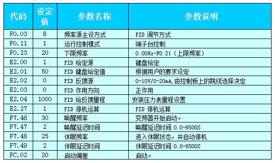 50。如果(guo)不(bu)會計算給定壓力百分比,也可以采用一個(ge)笨(ben)辦法,就是啟動變頻器,同時觀察監(jian)視(shi)功能組里(li)面d0.16的(de)(de)數值和遠傳(chuan)壓(ya)(ya)力表指針(zhen)的(de)(de)數值,當遠傳(chuan)壓(ya)(ya)力表到達用戶(hu)要(yao)求的(de)(de)壓(ya)(ya)力后,此時d0.16顯示的數值就是E2.01需要設定的數(shu)值(zhi)。