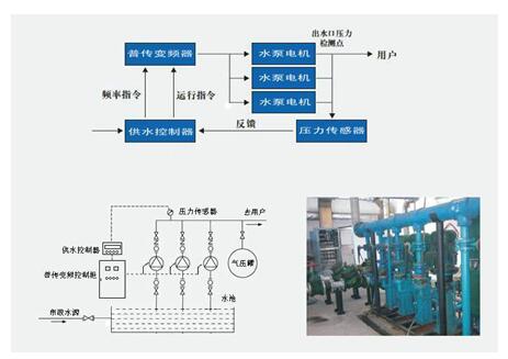 在變(bian)頻(pin)器(qi)恒壓供水(shui)系統中,安(an)裝在供水(shui)管(guan)網(wang)(wang)上的(de)(de)壓力(li)傳(chuan)感器(qi)不間(jian)斷(duan)地采集管(guan)網(wang)(wang)壓力(li)數據(ju),并將其轉(zhuan)換為標準(zhun)的(de)(de)電信號傳(chuan)輸(shu)(shu)至變(bian)頻(pin)器(qi),PLD調(diao)節(jie)(jie)器(qi)將接受到的(de)(de)信號(測量值(zhi))與預先設定(ding)(ding)的(de)(de)壓力(li)值(zhi)(給(gei)定(ding)(ding)值(zhi))進行邏輯運(yun)算,并將運(yun)算的(de)(de)結果轉(zhuan)換為頻(pin)率調(diao)節(jie)(jie)信號,進而調(diao)節(jie)(jie)水(shui)泵的(de)(de)轉(zhuan)速。當用水(shui)量增(zeng)大管(guan)網(wang)(wang)壓力(li)下降時(測量值(zhi)低于給(gei)定(ding)(ding)值(zhi)),PID調(diao)節(jie)(jie)器(qi)使變(bian)頻(pin)器(qi)輸(shu)(shu)出頻(pin)率升高,水(shui)泵轉(zhuan)速也隨之加快(kuai)。當用水(shui)量減(jian)小管(guan)網(wang)(wang)壓力(li)上升時(測量值(zhi)高于給(gei)定(ding)(ding)值(zhi)),PID調(diao)節(jie)(jie)器(qi)是、使變(bian)頻(pin)器(qi)輸(shu)(shu)出頻(pin)率下降,水(shui)泵轉(zhuan)速也隨之減(jian)慢。從而維持管(guan)網(wang)(wang)壓力(li)的(de)(de)基(ji)本恒定(ding)(ding)。