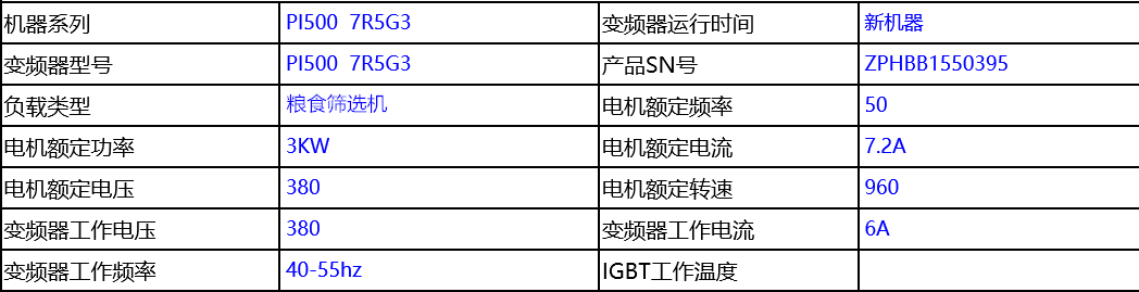 用(yong)(yong)工頻(pin)直接起(qi)(qi)動(dong)(dong),電(dian)機能以(yi)最(zui)快速度到達工頻(pin),篩體不(bu)容易產生機械碰撞甚(shen)至跳出(chu)軌(gui)道的情況。變頻(pin)器起(qi)(qi)動(dong)(dong)要(yao)(yao)想達到接近(jin)直接起(qi)(qi)動(dong)(dong)的效(xiao)果,需(xu)要(yao)(yao)加(jia)速時間很短,這(zhe)時起(qi)(qi)動(dong)(dong)電(dian)流會增加(jia),因(yin)此,變頻(pin)器選型(xing)時要(yao)(yao)注(zhu)意,需(xu)要(yao)(yao)加(jia)大(da)兩檔選型(xing),這(zhe)樣可以(yi)避免(mian)起(qi)(qi)動(dong)(dong)過程(cheng)中(zhong)出(chu)現過電(dian)流報警的現象(xiang),同時,也可以(yi)保證設(she)備(bei)(bei)安全穩定(ding)運行(xing)。根(gen)據設(she)備(bei)(bei)的使(shi)用(yong)(yong)情況,我們(men)為(wei)每臺設(she)備(bei)(bei)配套使(shi)用(yong)(yong)了一(yi)臺PI500 7R5G3變頻器。