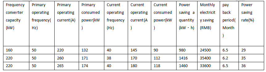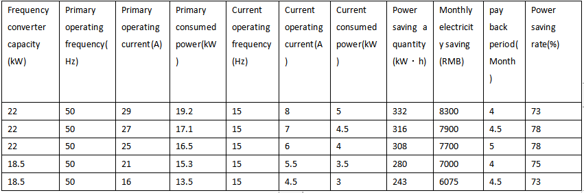 The field needs,and in the same output speed under the condition of power consumption is also higher than asynchronous motor about 20%;When the speed is reduced,the slip motor has lower efficiency and higher power consumption compared with asynchronous motor.Therefore,the variable frequency speed contorl system is used to replace the slipe speed control,overcome the above shortcomings,the speed contorl performance is far higher than the slip speed control motor,at the same time,the maintenance cost is also greatly reduced,has been widely used in the industry,cement co.,Ltd. And other unloading process conversion transformation.The energy-saving effect is shown in Table 3.