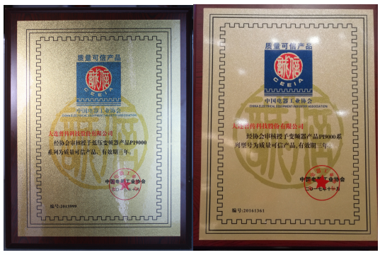 China electrical equipment industry association inverter branch in 2013 the general assembly, on October 11 ~ 13 was held in the beautiful Chengdu wangjiang hotel, the early stage of the organizing committee after organization industry well-known enterprises of technical expert review, review and the final report association, the selection of the 2012-2013 degrees "outstanding member" and "quality trustworthy product", known to science and technology won the award of "outstanding member", known to science and technology of PI9000 series inverter products won the "quality trustworthy product".On November 23, 2017, in the meeting of Inverter Branch of China Electrical Equipment Industry Association, PI9000 series inverter products of Powtran Technology won the "Quality Trusted Products" again.
