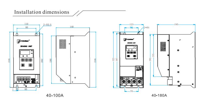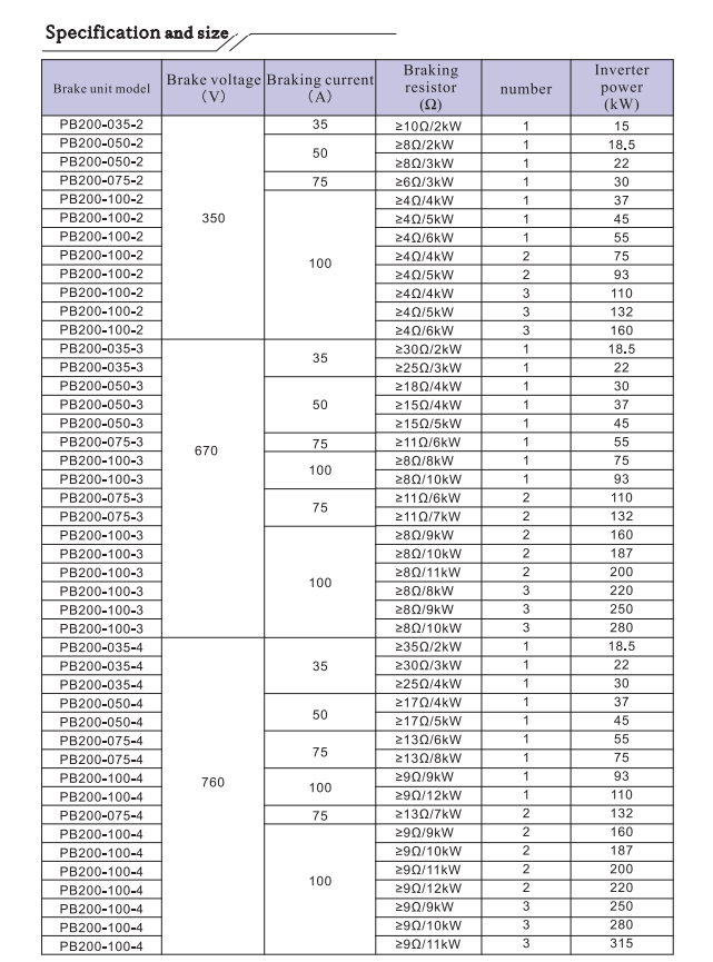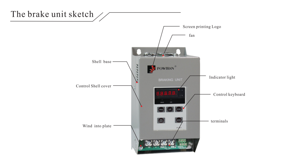 The PB200 series brake unit is designed by Powtran with advanced concept, it is a new type of inverter controlled motor which has increased the function of the keyboard.With excellent control performance and high reliability, can easily read the setting of various parameters;The function of the hardware and software is redesigned, and the function of current sampling is added.Over current, overload, short circuit, IGBT direct protection functions, the operation is reliable and stable.Increase the voltage tracking brake, the braking process is more smooth; increase the forced air cooling,Independent air duct design, fan external maintenance, with the function of the master and slave machine, more convenient for the brake unit to be used in parallel