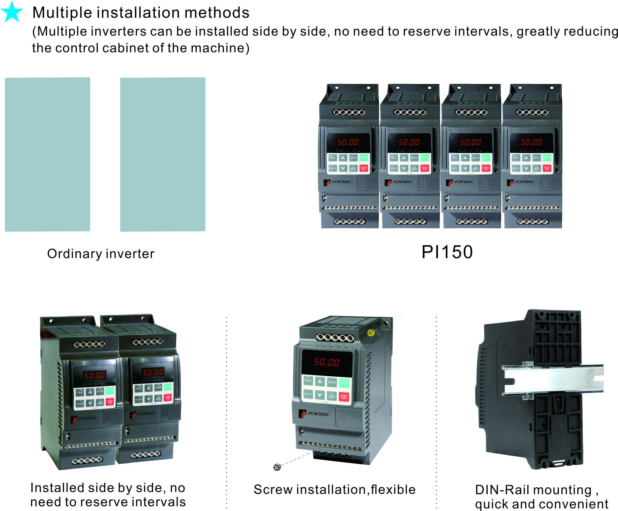 Powtran PI150 series smart frequency inverter is based on the market,with brand new design concept,a new generation of low-power inverters has been developed,which makes debugging easier,more efficient,and more reliable.