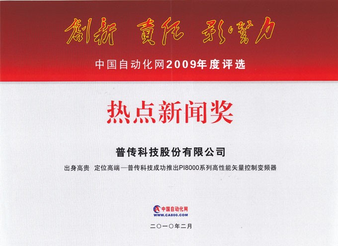 2010年3月9日,普傳科技參(can)加(jia)了(le)由中國自(zi)動化(hua)網、《變頻(pin)器世界》發(fa)起并聯合廣東省自(zi)動化(hua)學會(hui)(hui)等(deng)協會(hui)(hui)組織舉辦的2010年中國工業自(zi)動化(hua)產業發(fa)展(zhan)論壇暨年度評(ping)選頒獎典(dian)禮,在中國進出口商品交易會(hui)(hui)琶洲(zhou)展(zhan)館3.2館拉開(kai)帷幕(mu),此次評(ping)選以“創新、責任、影響力”為(wei)主(zhu)題(ti),在記錄自(zi)動化(hua)行業足跡…