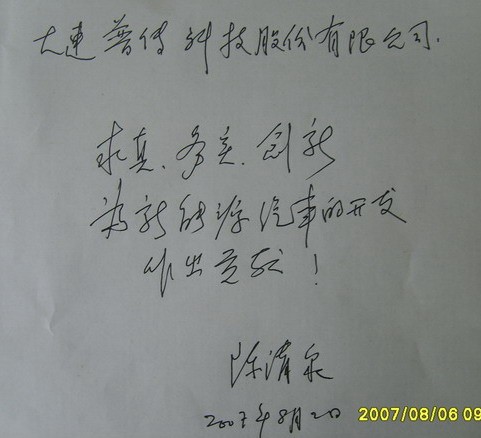 2007-8-21 9:03:05陳清泉(quan)院士(shi)為我(wo)公司題(ti)(ti)詞 2007年(nian)8月3日,2007混(hun)合動(dong)(dong)力(li)汽車控制技術研(yan)討會(hui)第二次會(hui)議(yi)哈爾濱召開(kai),參會(hui)期間,全(quan)國政協(xie)委員、國際電(dian)動(dong)(dong)車領域權(quan)威專家陳清泉(quan)院士(shi)聽了普傳科技關(guan)于混(hun)合動(dong)(dong)力(li)汽車關(guan)鍵部件(jian)電(dian)機及(ji)控制器的技術和產業化發展介紹后(hou)欣然題(ti)(ti)詞:“求(qiu)真、務(wu)…