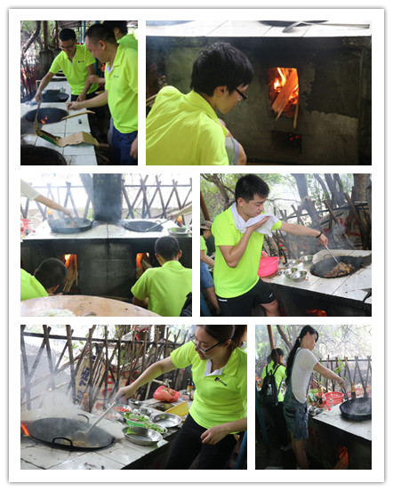 到了中午,大家自己生火做飯,親手烹飪美食。北風那個吹啊!身在云里霧里的大廚們被煙嗆個半死(沒經驗啊!)這邊熱火朝天,那邊摩拳擦掌,大家分工合作,負責采摘的同事挽起褲腿,擼起袖子也忙活的不亦樂乎!
