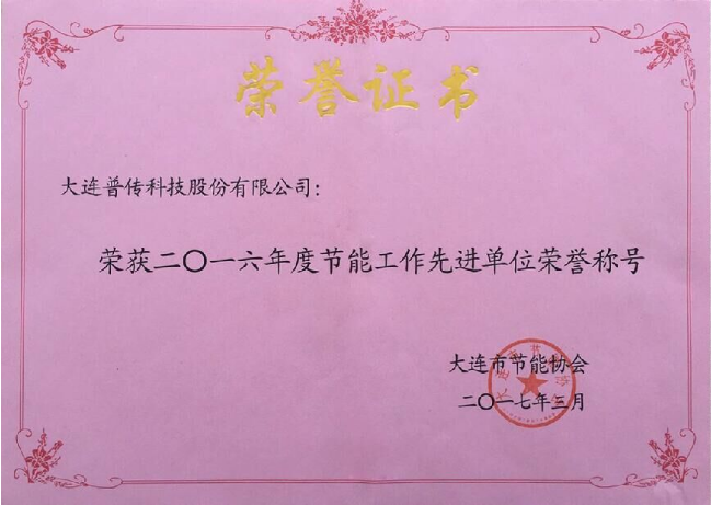 日前,大連市節能協會下發了《關于表彰2016年度節能先進工作單位的通知》,授予大連普傳科技股份有限公司“2016年度節能工作先進單位”。