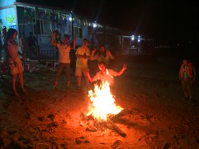 到了夜晚,美麗的海邊燃起熊熊篝火,我們歡笑,我們歌唱,我們把精彩留在了這里……
