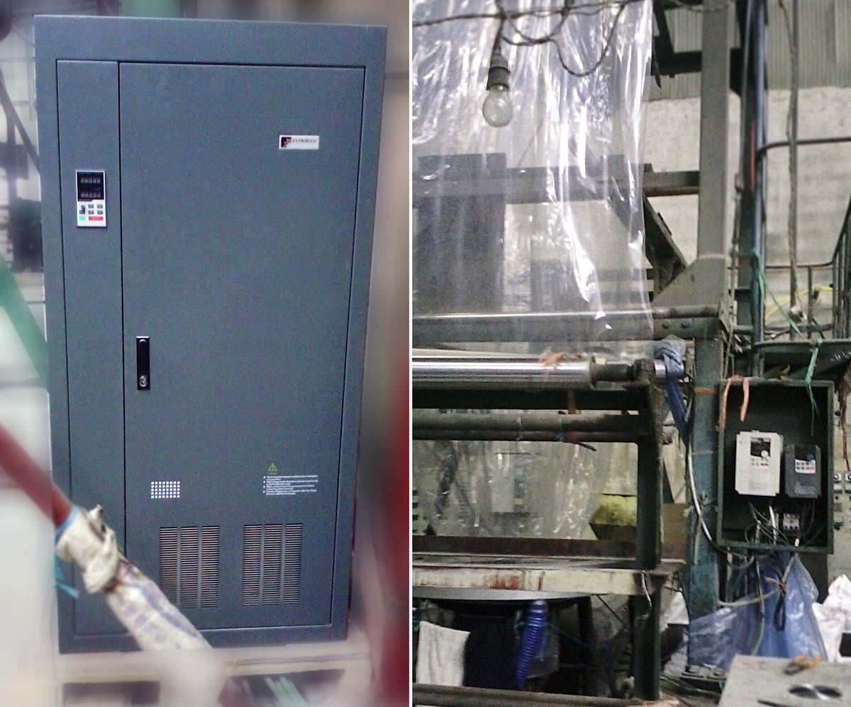 左邊是第一臺塑料吹膜機,右邊是我們的PI168變頻器,雖然看起來滿是灰塵,仔細一看機器編碼......