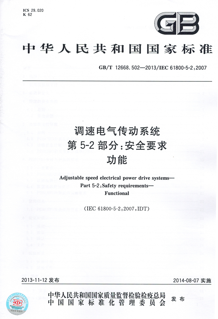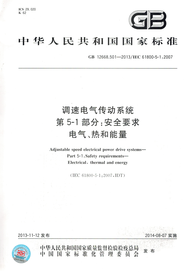 本部分標準由中國電器工業協會提出,全國電力電子學標準化技術委員會歸口,天津電氣傳動設計研究所有限公司等單位參加起草。該標準等同IEC61800 5 2007。2013年11月12日由國家質量監督檢驗檢疫總局和國家標準化管理委員會發布。