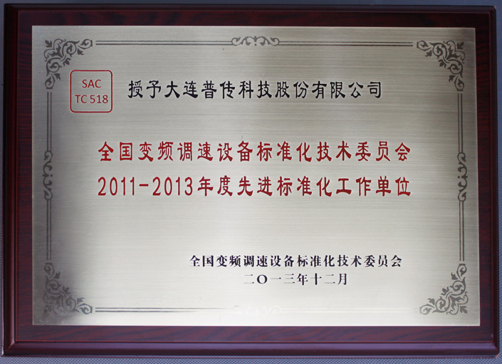 2013年12月,由全國變頻調速設備標準化技術委員會主辦,浙江省機電設計研究院協辦的2013年年會暨標準審查會在杭州舉行,上午特邀中國電器工業協會標準化與技術評價中心副主任曾雁鴻做“近期國家標準化重點工作及有關精神”的報告;隨后標委會做了2013年變頻標委會工作報告及2014年工作計劃,并對2011-2013年度全國變頻調速設備標準化技術委員會先進標準化工作單位進行了表彰,大連普傳科技股份有限公司獲得了殊榮。