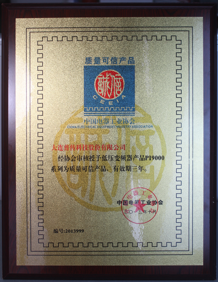 中國電器工業協會變頻器分會2013年會員大會,于10月11日~13日在美麗的成都望江賓館舉行,前期組委會經過組織行業知名企業的技術專家評審,上報協會進行復審和終審,評選的2012-2013度"優秀會員單位"及"質量可信產品",普傳科技榮獲"優秀會員單位"獎,普傳科技的PI9000系列變頻器產品榮獲"質量可信產品"。