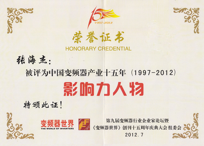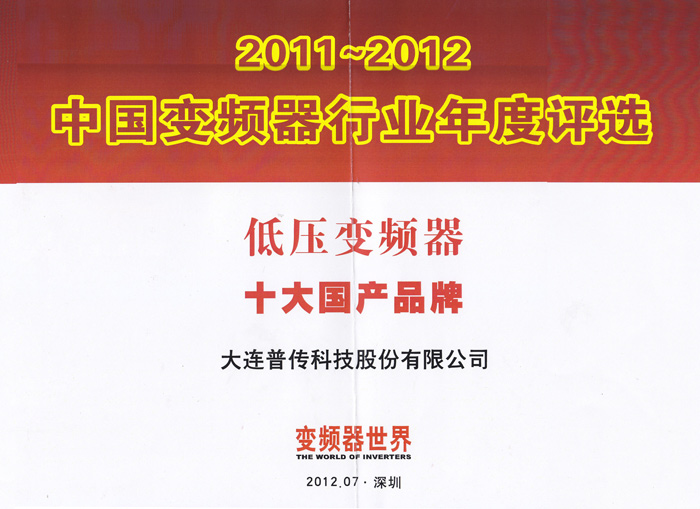 2012年7月6日,由《變頻器世界》、廣東省自動化學會、北京電力電子學會、中國電器工業協會電力電子分會、中國電源學會變頻電源與電力傳動委員會聯合舉辦的“第九屆變頻器行業企業家論壇”在深圳麒麟山莊隆重開幕。本次活動,經過權威媒體、行業專家的認真調查和嚴格審核結合網友投票,評選出了2011~2012年度行業各項大獎,評選出了一批十五年來為中國變頻器產業發展做出重大或突出貢獻,致力于推動中國變頻器產業發展、振興、提升,具有代表性和影響力的人物,普傳科技連續六年蟬聯——“低壓變頻器十大國產品牌”、董事長總經理張海杰獲得“中國變頻器產業十五年(1997~2012)影響力人物”。2012年,時值普傳科技11周年,這兩個大獎的獲得是對公司11年來始終致力于工控自動化領域的最好認可與證明。