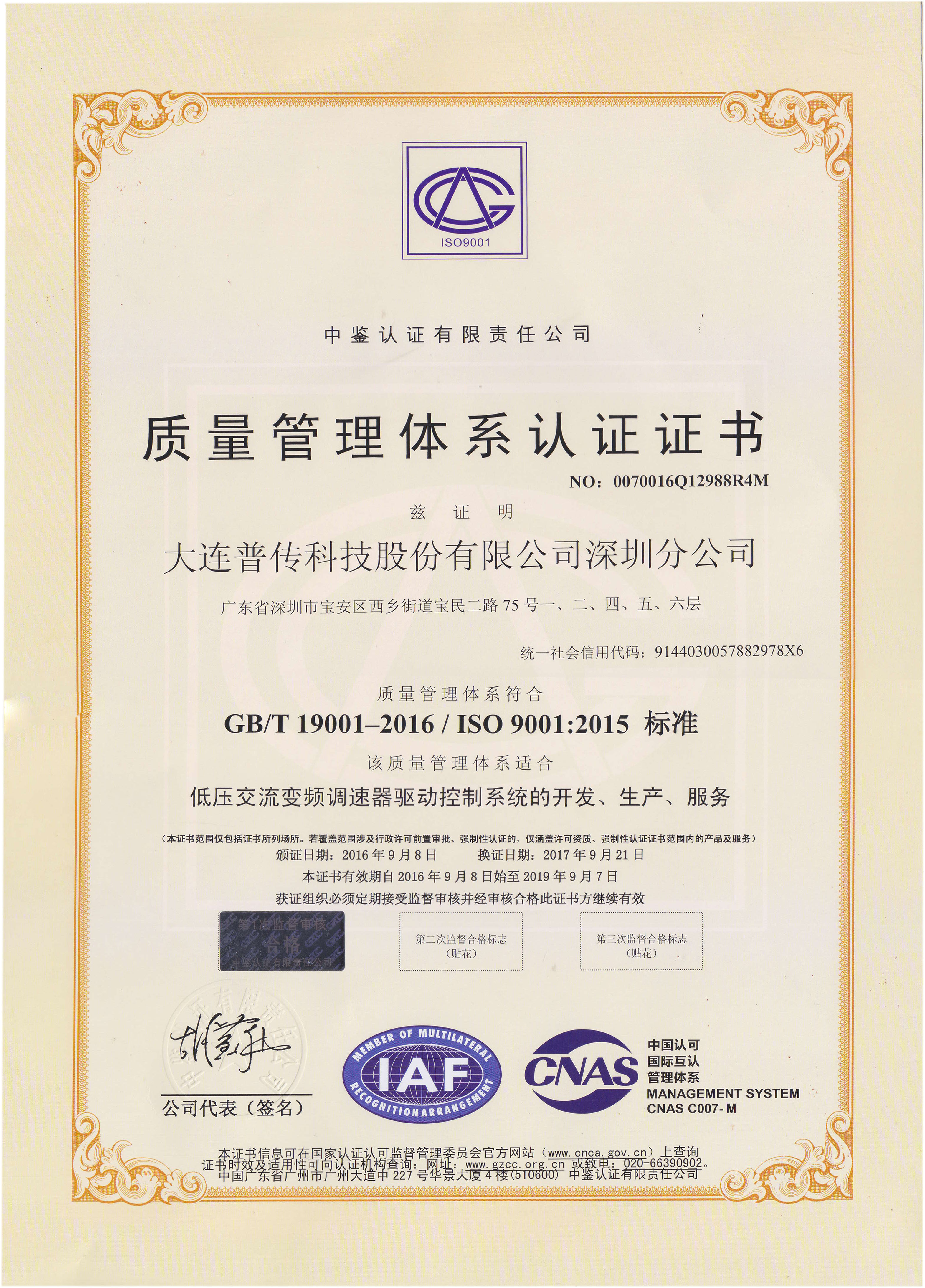 ◎1995年 普傳科技作為專業變頻器生產廠家在國內首家通過ISO9002:1994質量體系認證