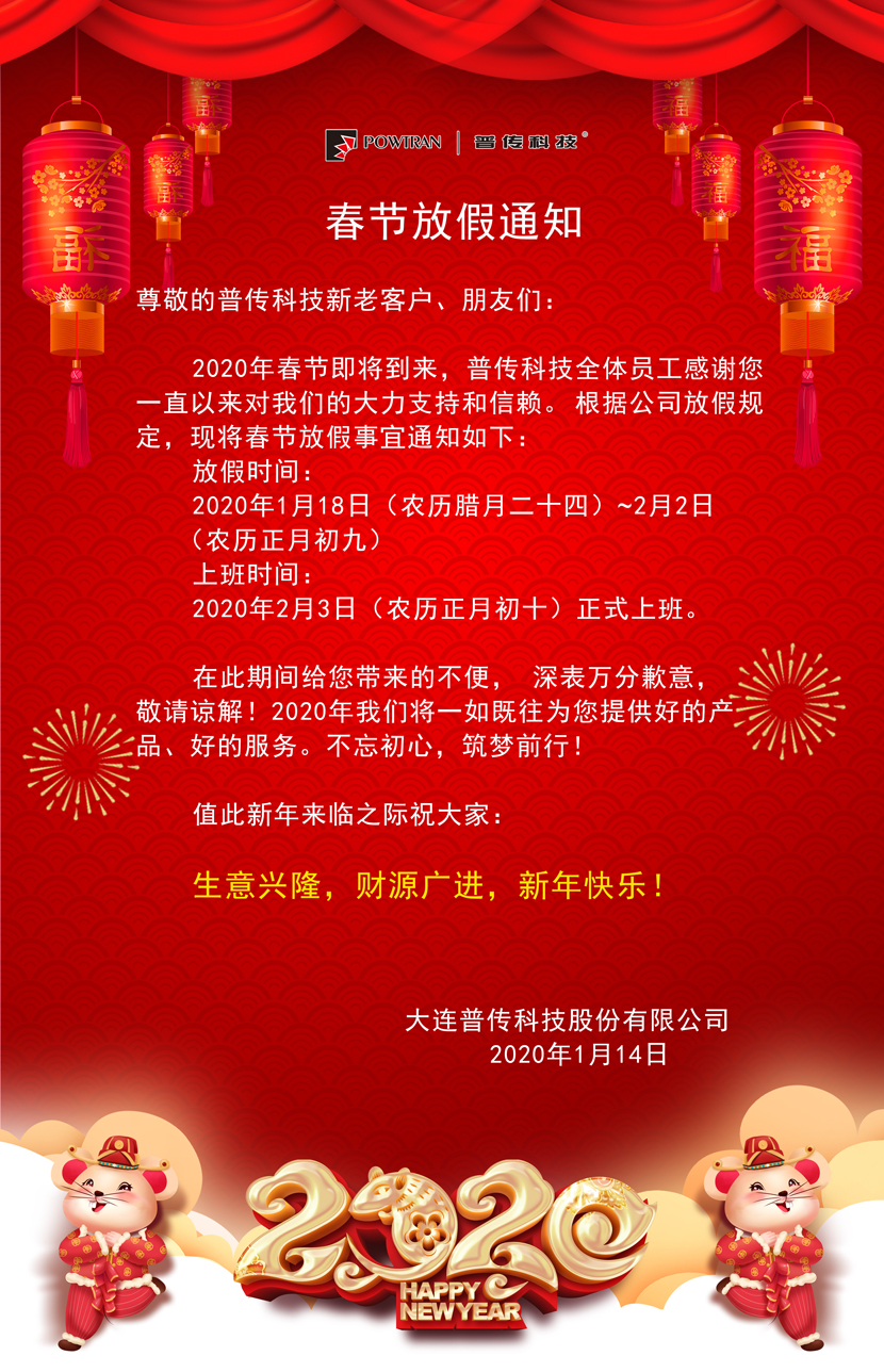 普傳科技2020年春節假期調整通知