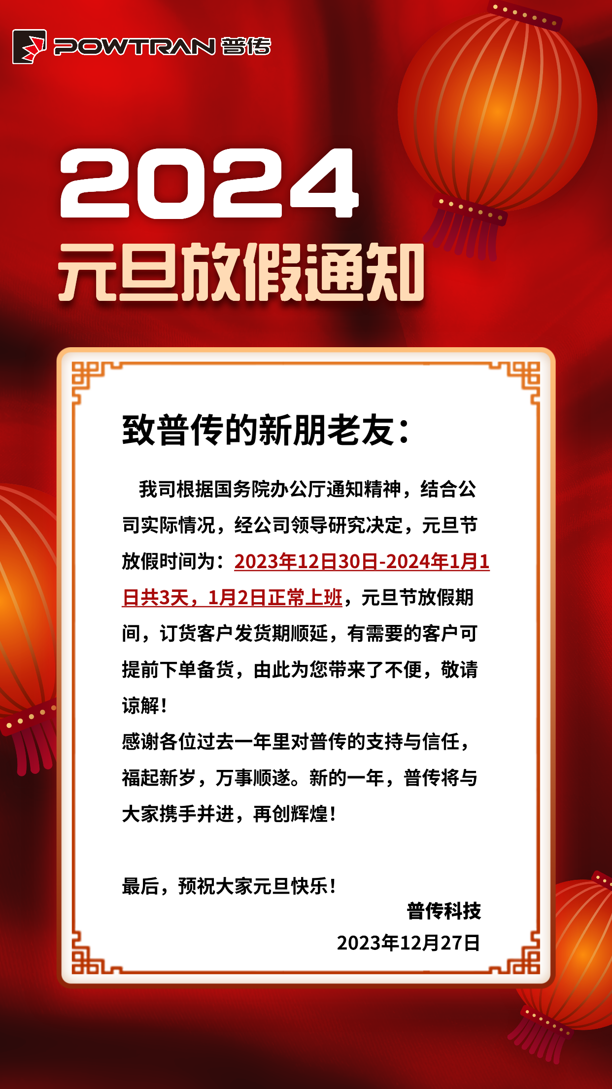 普傳科技2024年元旦放假通知