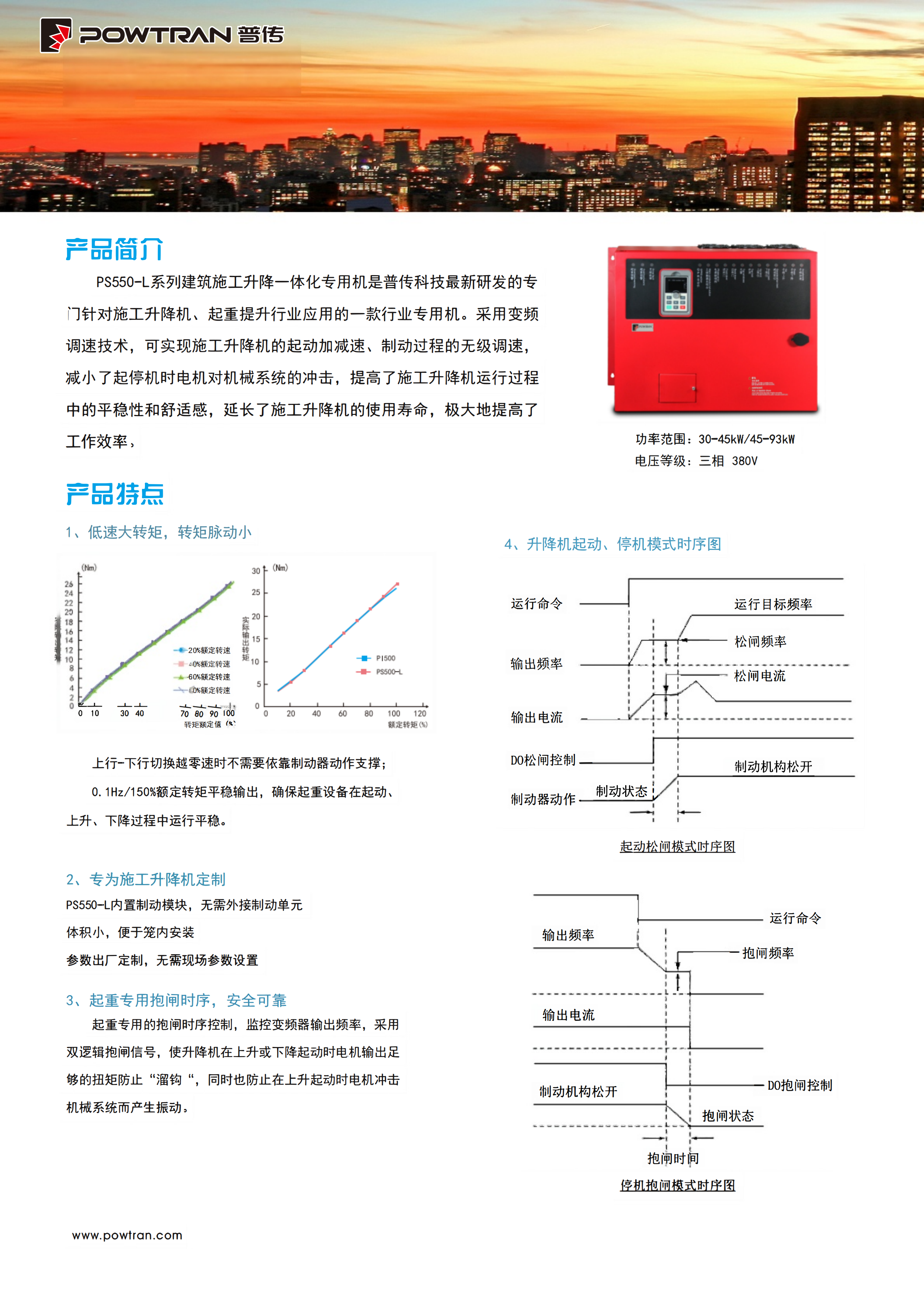 PS550-L系(xi)列建(jian)筑施工(gong)(gong)升降(jiang)一體化專(zhuan)用機(ji)(ji)(ji)是(shi)普傳科技(ji)最新研發(fa)的(de)專(zhuan)門(men)針對施工(gong)(gong)升降(jiang)機(ji)(ji)(ji)、起(qi)重提(ti)升行業應用的(de)一款行業專(zhuan)用機(ji)(ji)(ji)。采用變頻調(diao)速(su)技(ji)術,可(ke)實現施工(gong)(gong)升降(jiang)機(ji)(ji)(ji)的(de)起(qi)動(dong)(dong)加減速(su)、制動(dong)(dong)過程的(de)無(wu)級調(diao)速(su),減小了起(qi)停機(ji)(ji)(ji)時(shi)電機(ji)(ji)(ji)對機(ji)(ji)(ji)械系(xi)統的(de)沖擊,提(ti)高了施工(gong)(gong)升降(jiang)機(ji)(ji)(ji)運(yun)行過程中的(de)平穩性和舒適感,延(yan)長了施工(gong)(gong)升降(jiang)機(ji)(ji)(ji)的(de)使(shi)用壽命,極大地提(ti)高了工(gong)(gong)作效率。