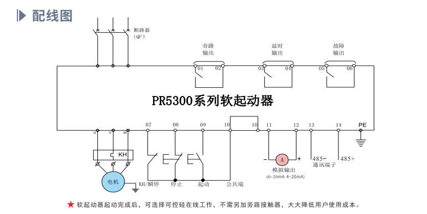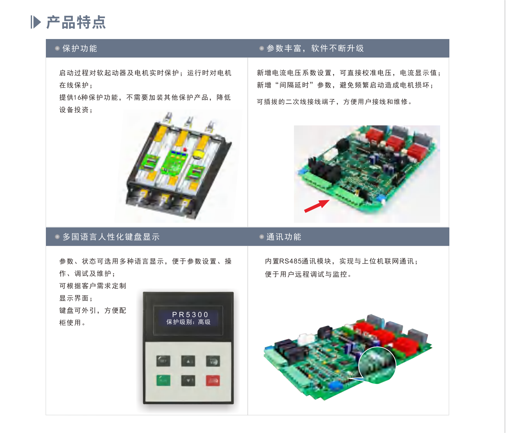 PR5300系(xi)列(lie)是電機(ji)軟(ruan)(ruan)起動及在線(xian)運行(xing)的(de)新(xin)一代(dai)智能化軟(ruan)(ruan)起動裝置(zhi),應(ying)用新(xin)型電機(ji)智能控制技術和(he)(he)專有(you)電機(ji)保護技術,參數(shu)豐富,多(duo)種起動方式滿足不(bu)同負載(zai)需求,保護功能更加完(wan)善,強(qiang)迫風冷散熱(re)系(xi)統(tong)保障設(she)備可靠運行(xing);內(nei)置(zhi)RS485通訊模(mo)塊支持遠程通訊,配置(zhi)多(duo)國語(yu)言人性化液晶鍵盤便于監(jian)控和(he)(he)操作,提高系(xi)統(tong)的(de)自動化水平;大功率低功耗可控硅在線(xian)運行(xing)省卻(que)旁路接觸(chu)器(qi),節省電氣柜空間,減少設(she)備投資和(he)(he)人工(gong)成本(ben)。