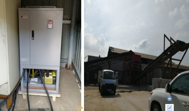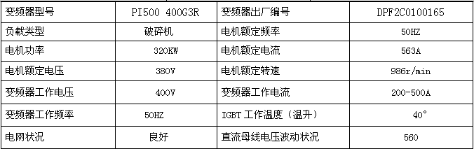 4.3.選型(xing)原則: 由于(yu)破碎機(ji)負載(zai)不恒定(ding),隨著(zhu)破碎對(dui)象的大小變(bian)化、喂(wei)料多少負載(zai)跳躍(yue)幅度(du)很大,要(yao)求(qiu)變(bian)頻(pin)(pin)器(qi)(qi)啟(qi)動(dong)(dong)轉矩大,過流能(neng)力強,因此(ci)變(bian)頻(pin)(pin)器(qi)(qi)的功率選擇上要(yao)比電(dian)機(ji)大2檔。本方案(an)采用一(yi)臺(tai)PI500 400G3變(bian)頻(pin)(pin)器(qi)(qi)帶動(dong)(dong)一(yi)臺(tai)320kw電(dian)機(ji),變(bian)頻(pin)(pin)器(qi)(qi)通過外部(bu)端(duan)子啟(qi)動(dong)(dong),使用變(bian)頻(pin)(pin)器(qi)(qi)起動(dong)(dong)控制系統平(ping)穩(wen)(wen),運行電(dian)流穩(wen)(wen)定(ding)。