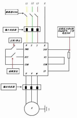 變頻器是水泵電(dian)機的(de)(de)控(kong)制(zhi)(zhi)設備(bei),能按照(zhao)水壓(ya)(ya)恒(heng)(heng)(heng)定需要將0~50Hz的(de)(de)頻率信號(hao)供給水泵電(dian)機,調整其(qi)轉速(su)。水壓(ya)(ya)由安(an)裝在管網(wang)的(de)(de)干線(xian)上壓(ya)(ya)力傳感器檢測,并將其(qi)轉化為4~20mA的(de)(de)電(dian)流信號(hao),反(fan)(fan)饋給變頻器。變頻器根(gen)據設定的(de)(de)給定值和(he)反(fan)(fan)饋的(de)(de)實際值(變頻器控(kong)制(zhi)(zhi)端口IF反(fan)(fan)饋),即根(gen)據恒(heng)(heng)(heng)壓(ya)(ya)時對應(ying)的(de)(de)電(dian)壓(ya)(ya)設定值與從壓(ya)(ya)力傳感器獲得的(de)(de)反(fan)(fan)饋電(dian)流信號(hao),利用PID控(kong)制(zhi)(zhi)自動調節(jie),改變頻率輸出值來調節(jie)所控(kong)制(zhi)(zhi)的(de)(de)水泵電(dian)機轉速(su),以保(bao)證(zheng)管網(wang)壓(ya)(ya)力恒(heng)(heng)(heng)定要求。