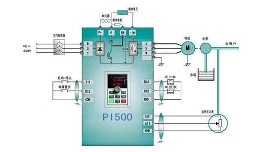 普(pu)傳PI500系列變頻器(qi)(qi),內置PID控(kong)制(zhi)器(qi)(qi),在恒壓供水系統中,只需在用戶管網中配置一個的(de)壓力傳感器(qi)(qi)( 遠傳壓力表或壓力傳送器(qi)(qi) ),就能構成(cheng)一個壓力閉(bi)環控(kong)制(zhi)系統。