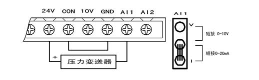 通常電流型的壓力(li)變(bian)送器都(dou)是(shi)二線制的,如果用變(bian)頻器的24V電源,需要(yao)COM端子與GND端(duan)子連起(qi)來。變頻器24V接(jie)壓力變(bian)送器的(de)正端,壓力變(bian)送器的(de)負端接(jie)變(bian)頻器的(de)AI1端(duan)子(即電流模(mo)擬量輸入端(duan)請(qing)將控制板(ban)AI1跳線改到電流位置(zhi))。