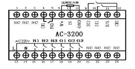 壓力表(biao)有紅(hong)、黃、藍(lan)三根引出線(xian)。紅(hong)線(xian)接變(bian)頻(pin)器+10V, 藍(lan)線接變頻器GND, 黃(huang)線接變頻器AI1